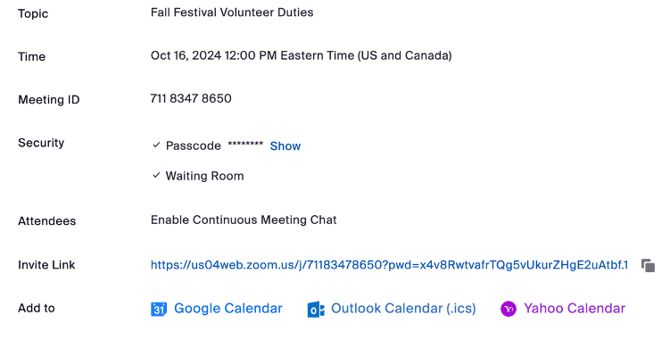 A Zoom invitation from a family member, boss, or co-worker will contain all the information you need to join the meeting—including the meeting date and time, a clickable link to join the meeting, and the Meeting ID. For security reasons, all Zoom meetings must also have either a passcode or a waiting room, which allows the host to control who joins the meeting (and when). The invitation may also have dial-in numbers for people who want to join by phone, as well as any additional details from the meeting host.