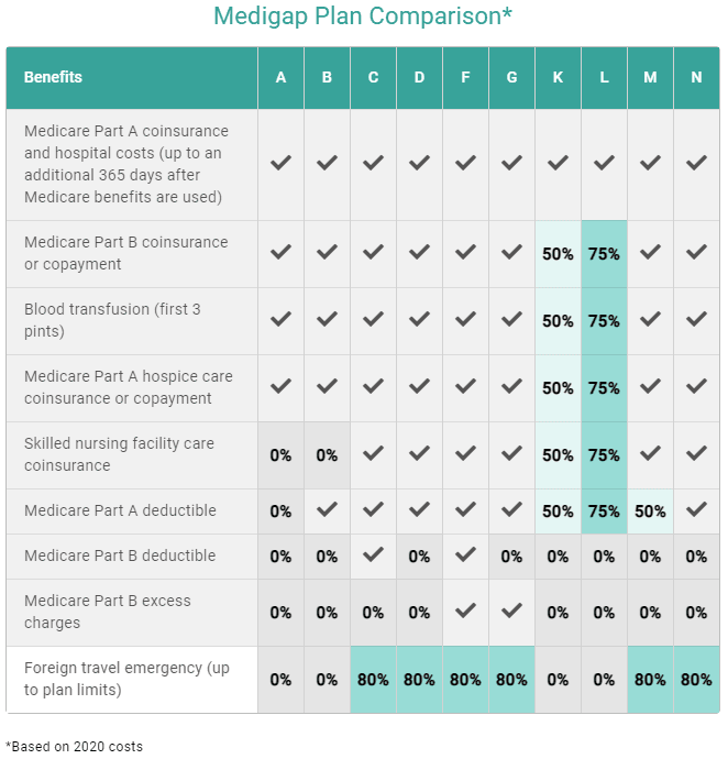 The chart below provides a basic idea of the different benefits Medigap policies cover.
