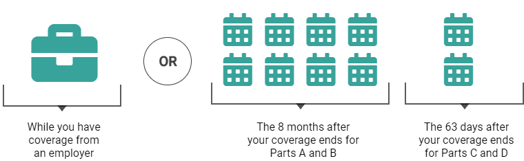 Once your creditable health care coverage ends—or when employment ends (whichever comes first)—you qualify for an eight-month Special Enrollment Period. It's a good idea to enroll in Medicare before you lose your employer-sponsored health care plan; this will help you avoid any gaps in your coverage. If you do not enroll in Part A and/or Part B before the eight-month window is over, you may have to pay penalties Learn more about penalties.Â