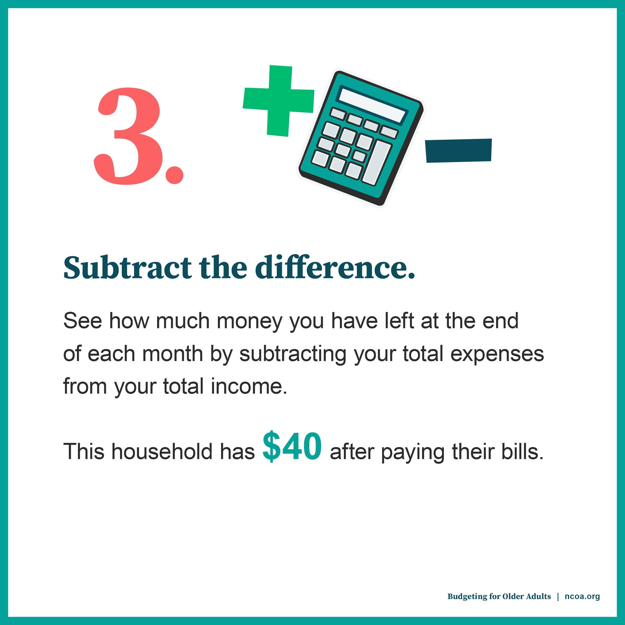 Step 3: Tally up. Subtract your total expenses from your total income to see where you stand.